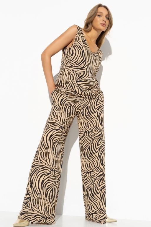 Костюм брючный в стиле сафари от компании Charutti, выполнен из штапельного полотна бежевого цвета с принтом. Топ без рукавов, классического фасона, длина до линии бедра. Круглый вырез горловины. Брюки свободного кроя, пояс на завязках. Идеальный выбор для Вашего женственного гардероба.