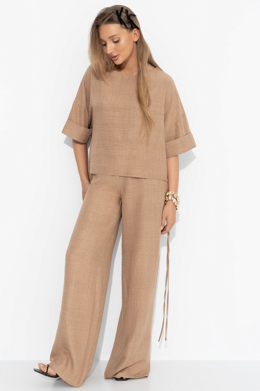 Костюм-двойка брючный бежевого цвета от компании Charutti, выполнен из ткани: «Аэролён». Блуза свободного кроя, линия плеча спущена. Есть тонкие завязки по подолу изделия. Брюки широкие, пояс на широкой скрытой резинке. Есть карманы. Стильный вариант для создания женственного образа.