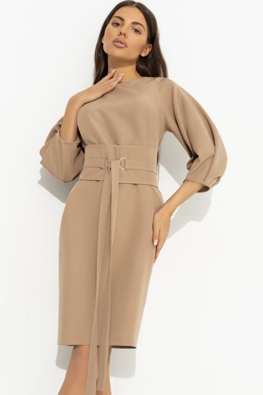 Платье бежевое с поясом от компании Charutti. Модель полуприлегающего силуэта, выполнена из костюмного полотна "барби". Круглый вырез горловины. Укороченные рукава. Без застёжки. Низ ровный, по спинке разрез .Это Ваш отличный образ, в котором вы всегда чувствуете себя уверенно.