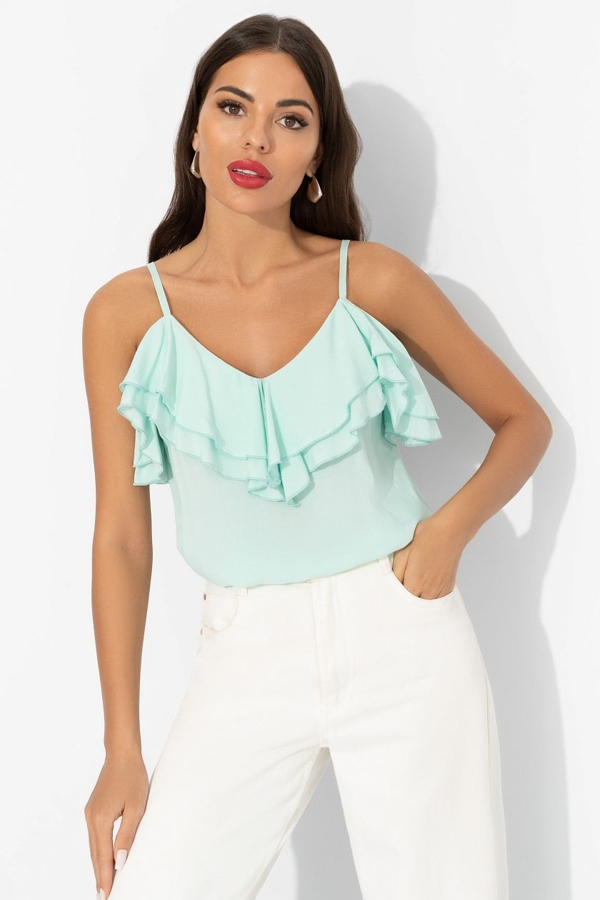 Топ из вискозы мятного цвета с воланами от компании Charutti. Модель прямого силуэта, V-образный вырез горловины по переду. Топ на тонких бретелях. Идеальный выбор для Вашего стильного гардероба.