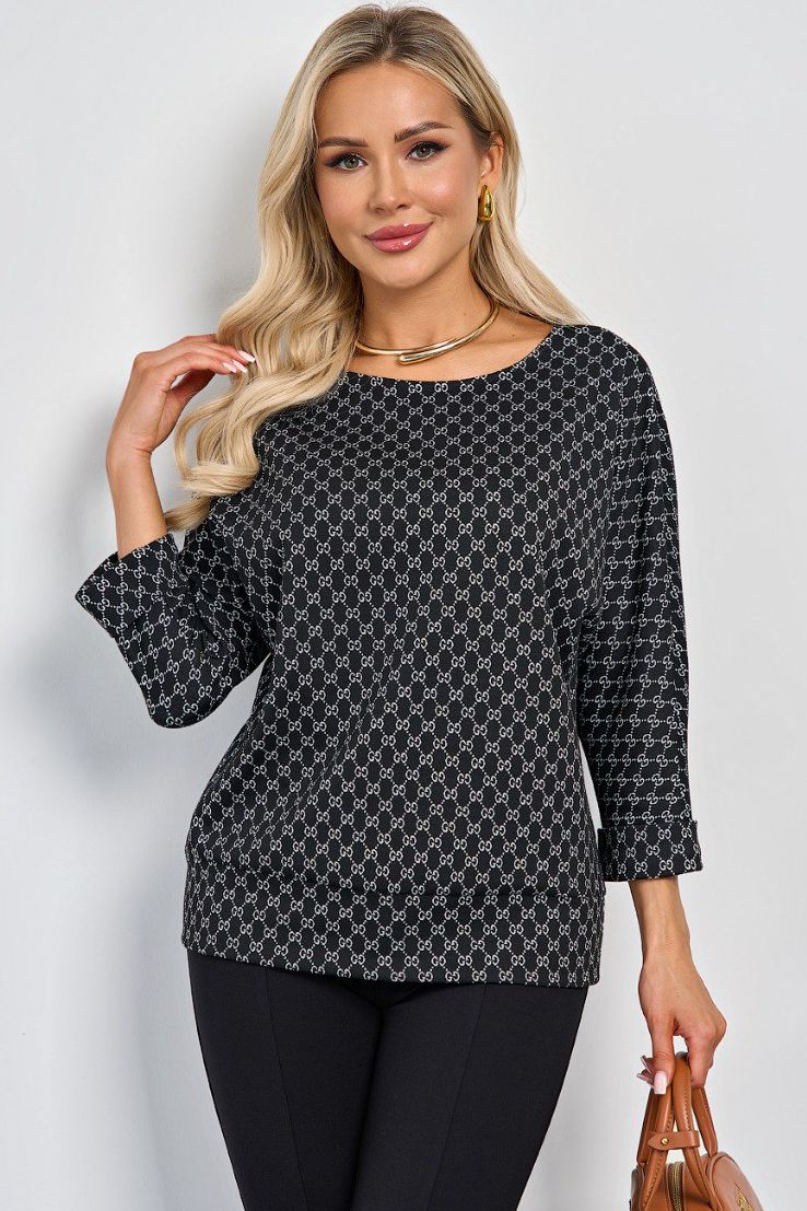 Джемпер чёрный трикотажный с рукавом три четверти от компании Jetty. Модель прямого кроя, круглый вырез горловины. Втачные рукава силуэта летучая мышь. По низу изделия широкий притачной пояс. Нежный образ для повседневной носки.