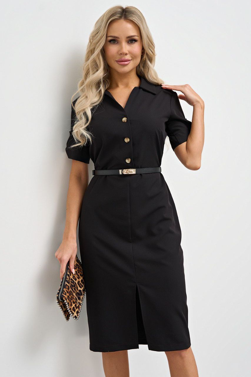 Платье чёрное с разрезом от компании Jetty. Модель полуприлегающего силуэта, выполнена из костюмного полотна. Отложной воротник-стойка. Втачные короткие рукава с патами. Отрезное по линии талии, верх застёгивается на пуговицы. Спинка изделия со средним швом. Идеальный выбор на каждый день. Ремень не идет в комплекте, продается отдельно.
