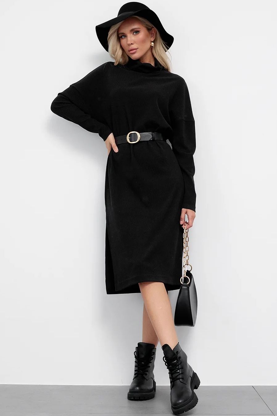 Платье чёрное трикотажное от производителя Jetty. Модель свободного силуэта, воротник-стойка. Длинные рукава, со спущенной линией плеча. Низ ровный, по бокам разрезы. Отличное решение для Вашего стильного гардероба. Ремень в комплект не входит.