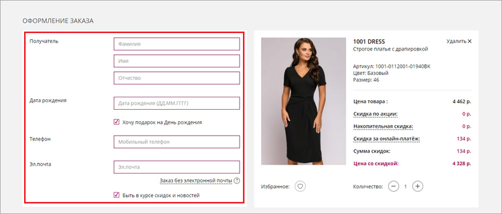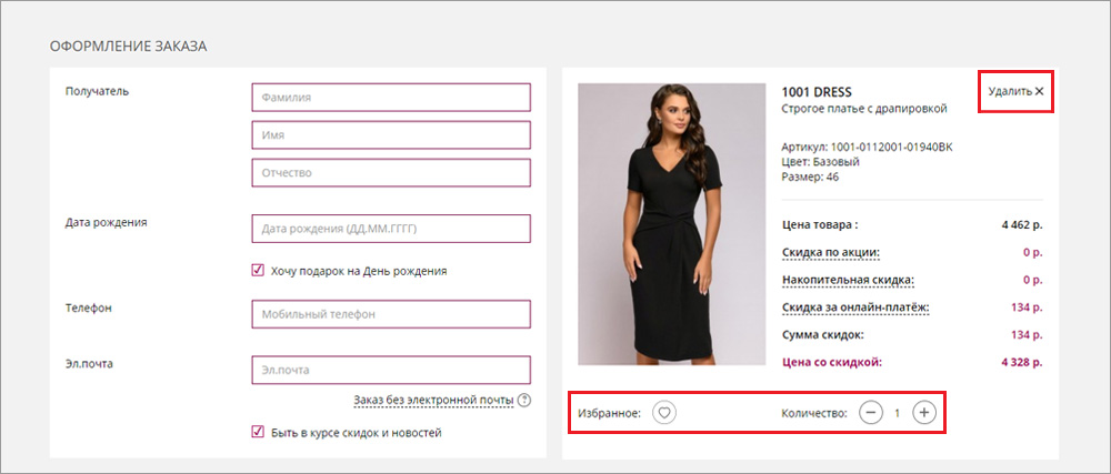 5. На странице оформления заказа проверьте выбранные вами параметры. Здесь можете изменить количество, удалить товары из корзины и сохранить их в вашем «Избранном»: