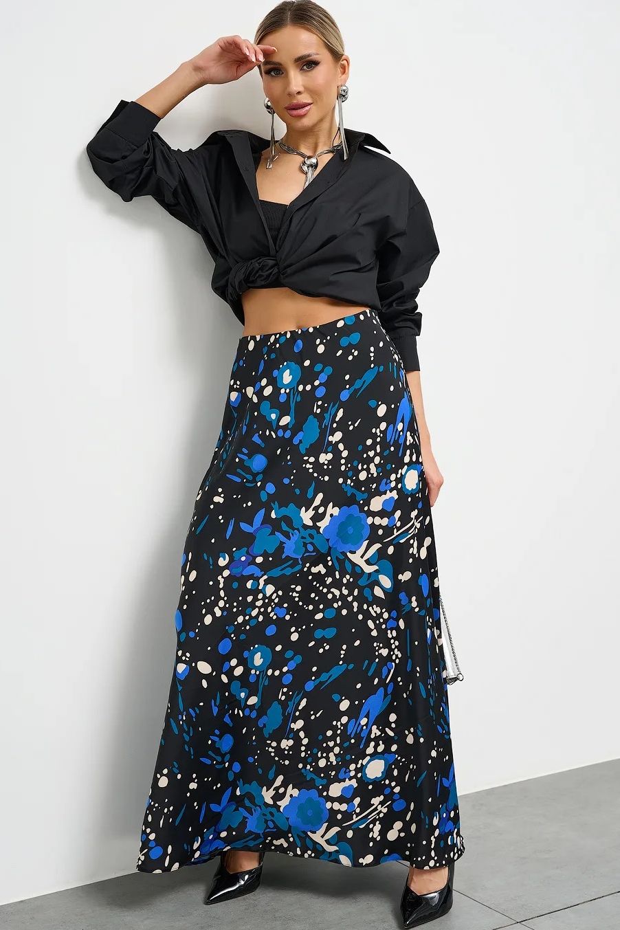 Юбка длины макси атласная чёрная с принтом