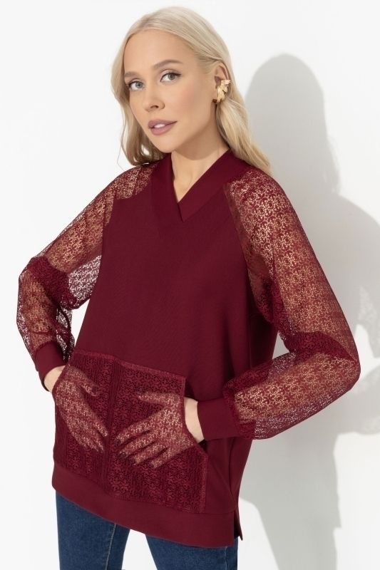 Свитшот трикотажный бордовый с рукавами из кружева