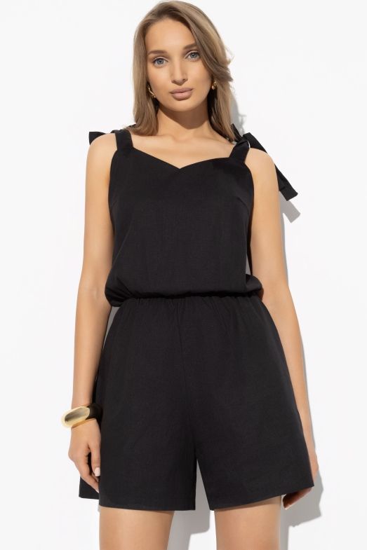Комбинезон чёрный без рукавов от компании Charutti. Модель свободного силуэта, выполнена из льна. Фигурный вырез горловины. С лямками на завязках. По бокам карманы. Идеальный выбор на каждый день. Ремень в комплект не входит.
