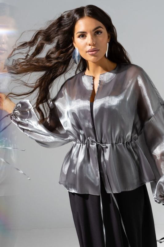 Жакет нарядный серый из органзы от компании Charutti. Свободный укороченный. Пояс на тонких завязках. Спущена линия рукава. Рукав оформлен длинными завязками. Идеальный выбор для создания стильного образа.