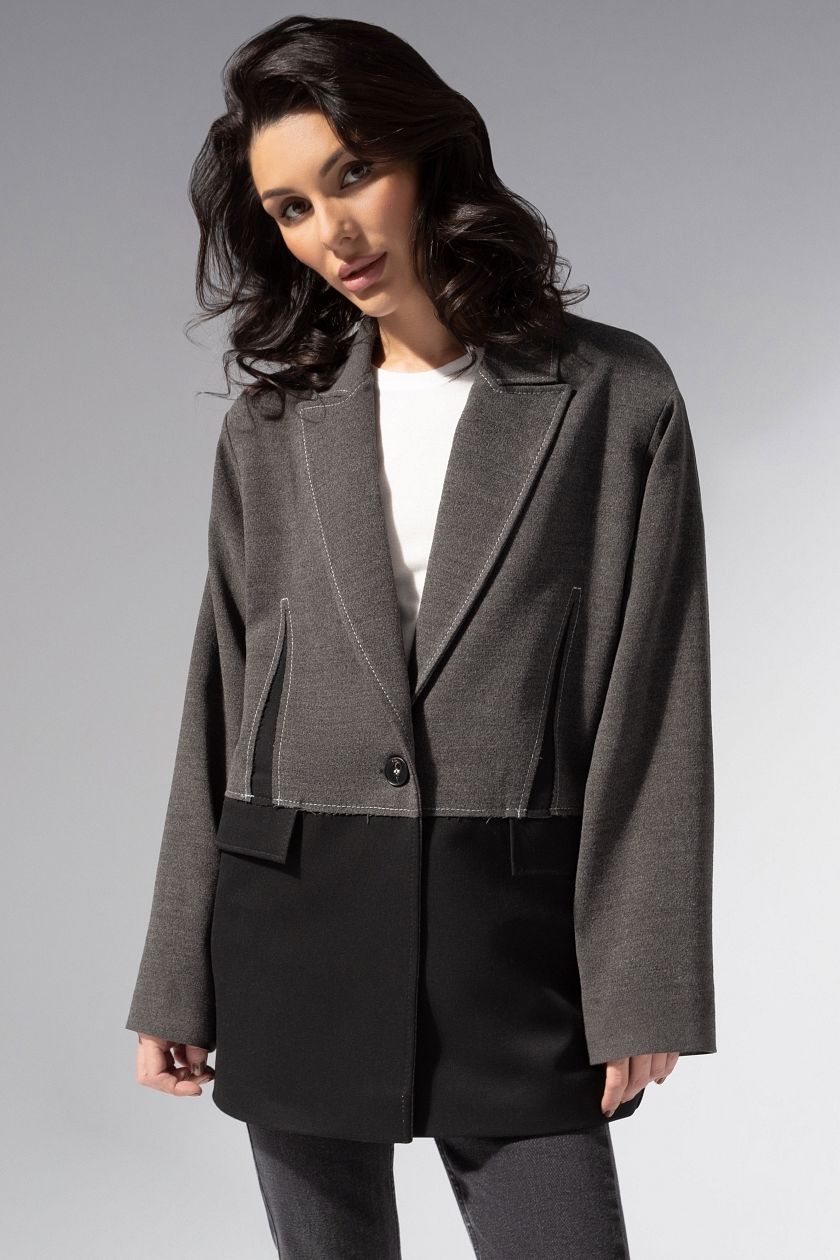 Жакет с контрастными швами от компании Charutti. Комбинированный жакет из двух видов костюмной ткани «тиар брам» и «пикачо», «плат кагзи».Чёткая линия плеч, свободный силуэт, застёжка на одну пуговицу. Есть подклад контрастного цвета. Идеальный вариант под любой наряд - супер-находка для современных леди.